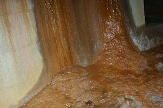 150mも進んだだろうか。漏水箇所が見えてくる。コンクリートの隙間から勢いよく水が噴出している。 |