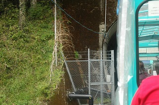その未成線の錦町駅と雙津峡温泉駅の間は,岩日北線(がんにちきたせん〜アナウンスでもガイドでもそう言っていた。がんにちほくせんだと思うのだが。)記念公園として整備され,山口きらら博で使われた車両を転用した「とことこトレイン」が,観光客を乗せて走っている。 |
