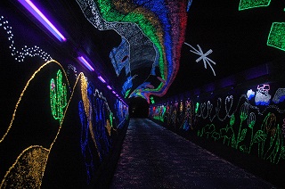 とことこトレインは,錦町駅を出発するとすぐに,園内最長の広瀬トンネルへ突入する。 この広瀬トンネルは,内部に蛍光石を使った壁画が描かれていて,それをブラックライトで照らしているものだから,なかなかきれいだ。きらら夢トンネルという愛称もつけられている。 車両はゆっくりと走り,一番の見所である真ん中あたりで一時停車して下車見学もできるようになっている。 |