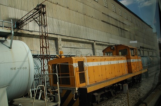 現在では,1往復/日だけあるという貨物列車。中国電力三隅発電所で発生した石炭灰(フライアッシュ)をこの伊佐工場に運んできて,炭酸カルシウム(石灰石)を積んで帰る。(ちなみにルートは山陰本線岡見駅−益田−新山口−厚狭−美祢−伊佐) |