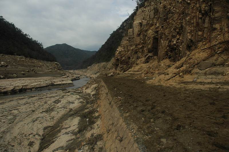 このあたりはさすがに,干上がって長いせいか,湖底に堆積した砂や泥が侵食されて,もともとの川底が現れているようです。