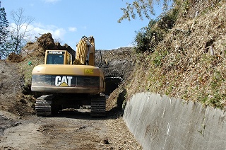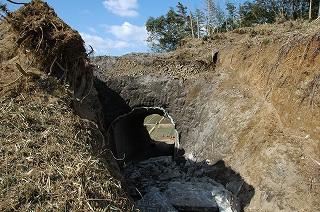 ちょうど工事が休みの日であったため,近くまで入ることが出来た。小さな尾根をくぐる短い隧道である。 大分県の古いトンネルは凝灰岩などの岩をくり抜いた小さなものが多いのだが,ここではやわらかい黒土を掘って隧道としている。 コンクリートの吹き付けにより補強されていたようだ。 |