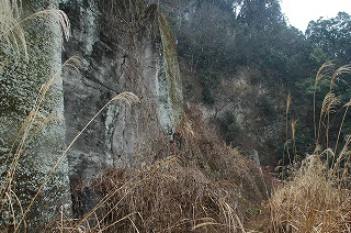 | 行き止まりの先は昔の落石防止壁?なども設置され,ススキや茨のはびこる道となる。 また,大規模ながけ崩れがあった模様で,大きな岩が積み重なっている。崖を見た感じだと不安定な部分は落ち切っているようだが,ぐらつく岩もあったりして危険なことには変わりない。 |