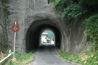 | 玖珠町の鏡山の南麓斜面に開かれた矢野集落にある短い隧道で,扁額によると昭和39年3月の竣工。近くには道路改修記念碑が立っている。 一段低いところに新矢野トンネルができているが,新道と旧道といった関係ではなく矢野隧道は集落の中を通って最終的には大分道の天瀬高塚インター方面へ抜ける。 新矢野トンネルは玖珠川の深い谷の斜面を下って国道210号へと抜ける道となる。 |