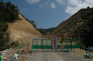 | 一方,切通の工事も行われており,まだ法面保護もされておらず,落石により全面通行止めとなっている状態で,町道?が建設中だ。 | ![]() |